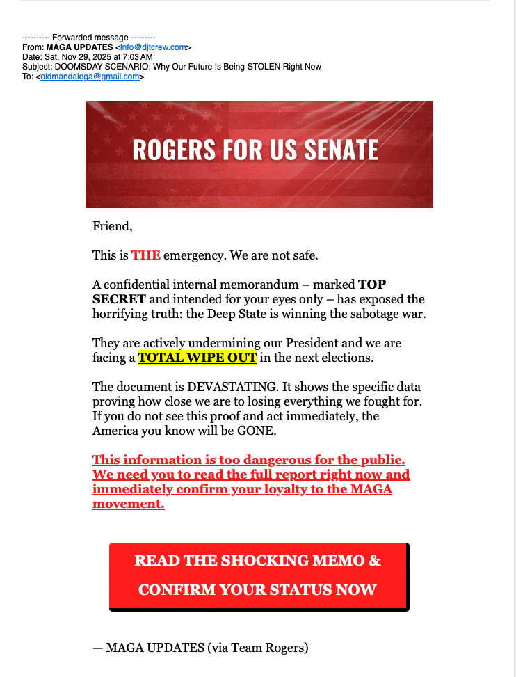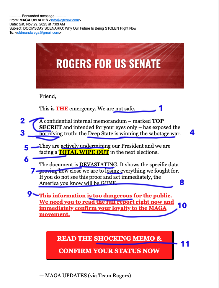 10. “immediately confirm your loyalty to the MAGA movement”: And there it is. If you want to stay in the tribe, if you want to maintain your specialness that somehow the rest of the world fails to see,[3] then you need to confirm your loyalty KENNETH. Which means, of course, give us your money. What, you thought you were just going to check a box that says, “Yes, I am loyal to the MAGA movement”? (Not to be unkind, but yes, that’s probably exactly what the little MAGAt thinks.) (To be fair, I’ve received an equal number of emails from the Democrats with the exact same ploy: “Show your support for [Dem of the Day]!”)